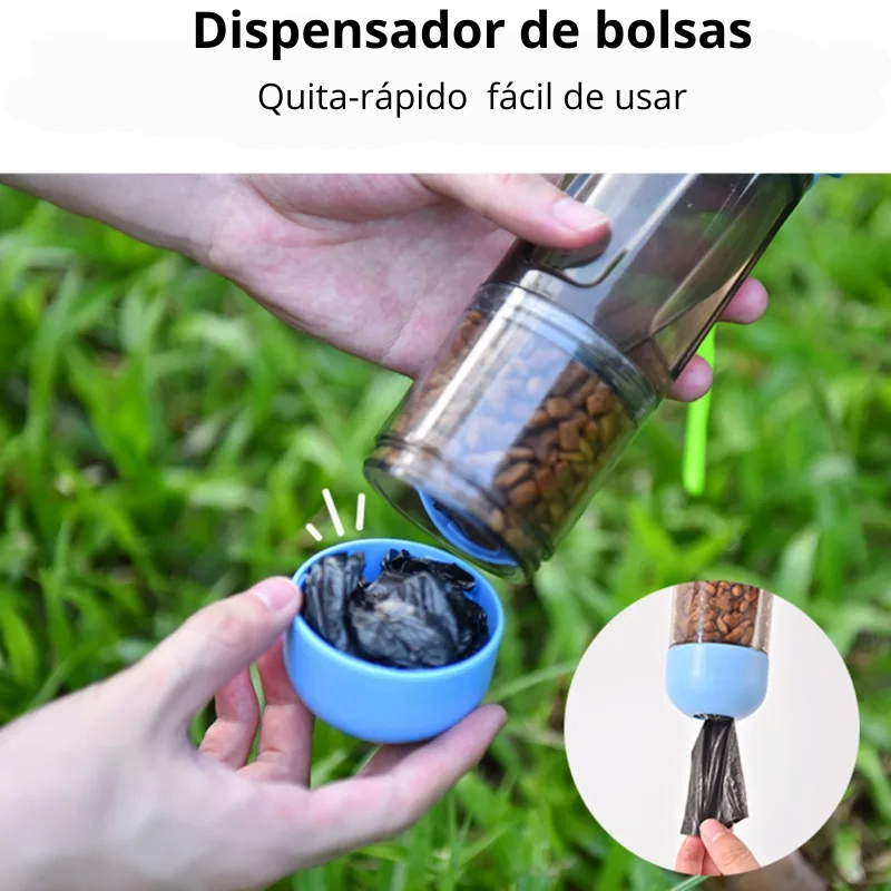3. Integración multifuncional; El diseño especial le permite obtener no solo una botella de agua sino también una caja de comida, una pala para excrementos y un dispensador de bolsas para excrementos.